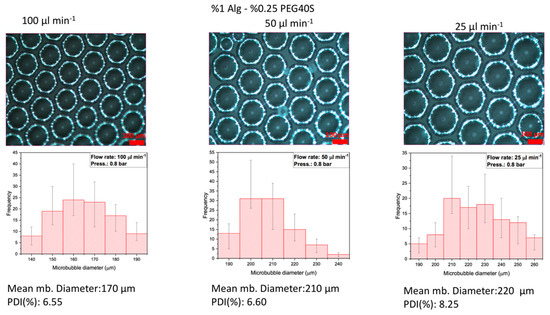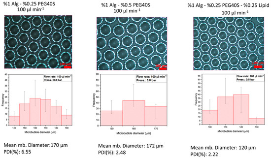 Figure 3 shows the digital microscopic images of microbubbles with variations in diameter and PDI values while keeping the flow rate constant at 100 µL·min−1 and varying the concentrations of alginate, PEG-40S, and phospholipid. With the concentration of %1 alginate–%0.25 PEG-40S, the mean diameter and PDI were 170 µm and 6.55%, respectively. By changing the concentration to %1 alginate–%0.5 PEG-40S, the mean diameter and PDI values changed to 172 µm and 2.48%, respectively. With the polymeric solution concentration of %1 alginate–%0.25 PEG-40S–%0.25 phospholipid, the mean diameter and PDI of the microbubbles obtained changed to 120 µm and 2.22%, respectively, showing promising results. The mean diameter and PDI ratio of the resultant 0.5 wt % PEG-40S-added and 0.25 wt % PEG-40S–phospholipid-added alginate-based microbubbles collected (Figure 3) were in the desired range and smaller than for the microbubbles seen in Figure 2.