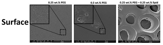 Changes of SEM morphologies of the alginate-based porous film structures formed as a function of PEG-40S (surfactant) and phospholipid concentrations at a constant N2 gas pressure of 0.8 bar and feeding liquid’s flow rate of 100 µL·min−1 (PEG-40S and phospholipid are denoted by PEG and lipid, respectively). Insets show an enlargement of the porous surface at 0.25% and 0.5% PEG samples, respectively.