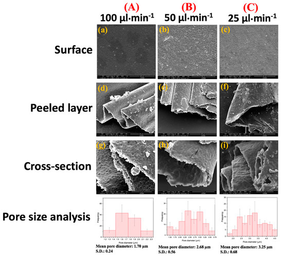 (a–c) SEM morphologies, (d–f) peeled surface, and (g–i) cross-sectional SEM images of the alginate-based porous films formed at a constant N2 gas pressure of 0.8 bar in a range of various feeding liquid’s flow rates: (A) 100 µL·min−1, (B) 50 µL·min−1, and (C) 25 µL·min−1 (the polymeric solution consisted of 1 wt % alginate and 0.25 wt % PEG-40S in this experimental work). The data in the Pore size analysis graphs are presented as the mean values of standard deviation (SD) of 100 pores.