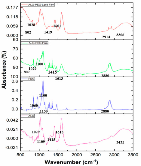 FTIR spectra of the pristine sodium alginate and PEG-40S used, and the resultant alginate–PEG and alginate–PEG–phospholipid porous films obtained (alginate, PEG-40S, alginate–PEG-40S, and alginate–PEG-40S and phospholipid are denoted by ALG, PEG, ALG–PEG, and ALG–PEG–Lipid, respectively).