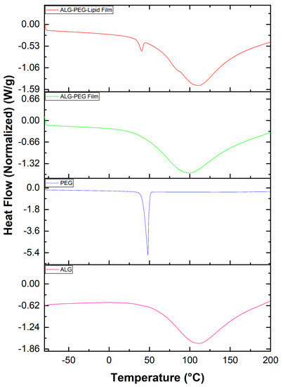 Sodium alginate exhibits an endothermic peak at 110 °C correlated with the loss of water associated with the hydrophilic groups of alginate described in Figure 7. The curve of pure PEG-40S had an endothermic peak at 48 °C starting from 36 °C, as shown in Figure 7. In the resultant film of alginate and PEG-40S, the peak is slightly shifted to a lower temperature due to the addition of PEG-40S and phospholipid to the sodium alginate and the peak area also decreases, as depicted in Figure 7. Simpliciano et al. showed that sodium alginate has an endothermic decay at 112 °C due to the removal of non-structural water, which provides information on the glass transition temperature (Tg) of sodium alginate polymers [38,39]. Tg is a very significant indication of molecular chain flexibility that could influence film drainage during the solidification process [40,41]. Therefore, we believed that it was necessary to investigate the Tg value influenced by PEG-40S and phospholipid proportions to explore the thermal properties of the porous films.