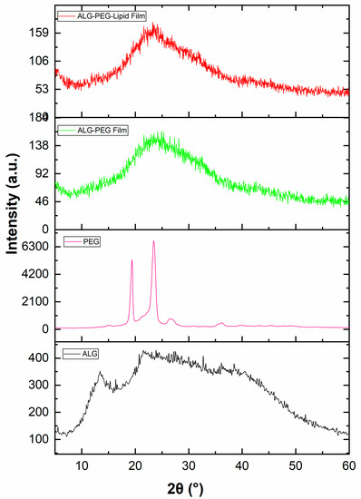 X-ray diffraction patterns of the pristine sodium alginate and PEG-40S used, and the resultant alginate–PEG-40S and alginate–PEG-40S–phospholipid porous films obtained (alginate, PEG-40S, alginate–PEG-40S, and alginate–PEG-40S, and phospholipid are denoted by ALG, PEG, ALG–PEG, and ALG–PEG–Lipid, respectively).