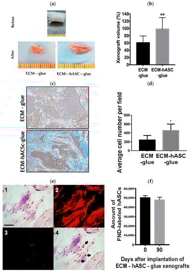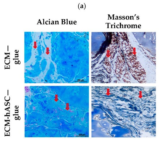 3.4. hASCs Maintained the Volume of Xenografts Containing Decellularized Cartilage and Fibrin Glue Polymer