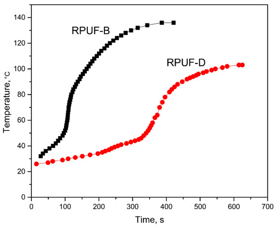 Inner temperature variation of foams prepared from unfiltered BBPs with (RPUF-B) and without (RPUF-D) neutralization by sodium hydroxide.
