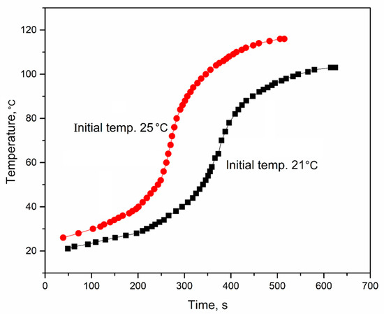 Figure 4 shows the inner temperature variation trend of RPUF-B and RPUF-D during the foaming process. It could be seen that the inner temperature of the two samples increased with respect to the test time. The inner temperature of RPUF-B reached the maximum value of 136 °C after 386 s, which is relatively higher and faster than that (103 °C after 625 s) of RPUF-D. The presence of sulfuric acid in the BBPs without neutralization would react with alkaline amine catalyst A-33 to slow down the reaction between the isocyanate and water during the preparation of RPUF-D, resulting in the mild exothermic process, thus the relatively low inner temperature. This is consistent with the observation of Figure 2 and Figure 3. Therefore, the neutralization procedure could be necessary to prepare the BBPs for the subsequent RPUFs synthesis. It was also found that the initial temperature of foaming mixture had an obvious effect on the inner temperature during the foaming process (Figure 5), illuminating that the high initial temperature of foaming mixture can accelerate the reaction rate to shorten the overall reaction time.