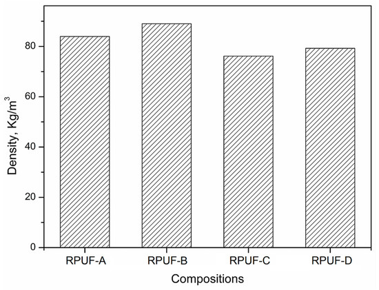 The apparent density of RPUFs is presented in Figure 6. It can be found that the apparent density of all RPUFs was in the range of 75–90 Kg·m−3, suggesting the formation of the dense structure. Furthermore, the apparent density of RPUF-A and B was higher than that of RPUF-C and D, respectively. The relatively high inner temperature of the RPUF-A and B would facilitate the formation of the framework of the urethane group in the stage of the gel reaction between the BBPs and isocyanate, resulting in the high apparent density of the prepared RPUFs. Thus, the remaining sulfuric acid in the BBPs exhibited a certain impact on the properties of the final RPUFs and should be removed by the neutralization with sodium hydroxide.