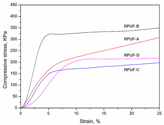 Stress-strain curves of the prepared RPUFs for the determination of the compressive strength.