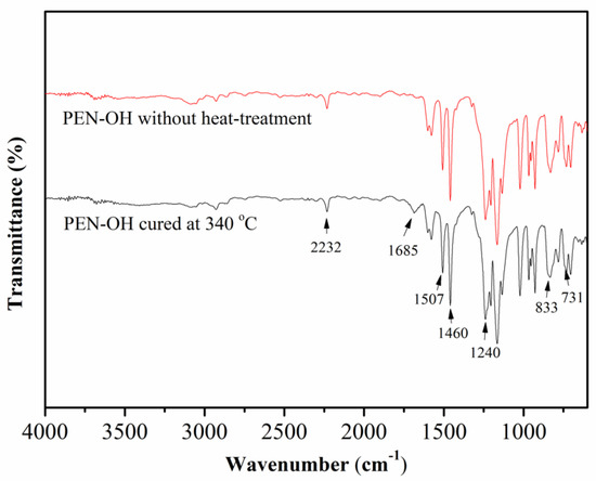 In order to verify the cross-linking reaction among the PEN–OH, the structures of the synthesized PEN–OH before and after heat-treatment were characterized by FTIR and the results are shown in Figure 3. As can be seen, two characteristic stretching bands emerged at 833 cm−1 and 731 cm−1 and the other two sharp and strong characteristic absorption bands at 1507 cm−1 and 1460 cm−1 were assigned to benzene rings. The absorption band emerging at 1240 cm−1 was clearly observed, which is attributed to skeleton vibration of the ether. These results suggest the existence of aryl ether (Ar–O–Ar) [25]. The characteristic stretching band appearing at around 2232 cm−1 suggested that the nitrile groups existed in the polymer [26]. Most importantly, a new characteristic absorption band appearing at 1685 cm−1 in PEN–OH with heat-treatment was assigned to the stretching vibration of –C=N– [27], indicating the formation of triazine ring, which provided supports for the cross-linking reactions among the PEN–OH.