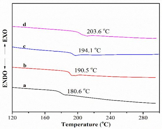 Figure 4 shows the DSC curves of the PEN–OH films with different temperature treatments. It can be seen that the glass transition temperature (Tg) increases as the heat treating temperature increases. When the heat treating temperature reaches 360 °C, the Tg of the cross-linked film increases to 203.6 °C, which is increased by 23.0 °C compared with that of the sample treated at 200 °C. At high temperature, the nitrile groups will react with each other to from a triazine ring, making the sample transform from a linear structure to a three-dimensional network structure at the presence of the hydroxyl groups, so that the Tg increases.