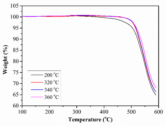Due to the cross-linking reaction occurring at a high temperature in this PEN–OH system, the thermostability of the PEN–OH films will be improved after heat-treatment. Figure 6 shows the TGA curves of the PEN–OH films with different heat-treatment temperatures. It can be seen that all the TGA curves of the PEN–OH films show similar thermal decomposition behavior. The temperatures corresponding to the weight loss of 5 wt% (T5%) of the PEN–OH are all above 500 °C, and the temperatures corresponding to the fastest thermal decomposition are about 550 °C. It is due to the fact that these samples possess similar structures. As the heat-treatment temperature increases, T5% of PEN–OH increases from 504.3 °C to 519.2 °C, and the char yield at the temperature of 600 °C increases from 64.8% to 68.1%. These results indicate that the thermal properties can be improved by the heat-treatment.