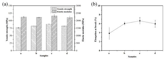 Figure 7 shows the mechanical properties of the PEN–OH films with different heat-treating temperatures. It is observed from Figure 7a that, firstly, the tensile strength increases and then decreases. Sample c, which was treated at 340 °C, possesses the best tensile strength of 88.2 MPa. This was 16.1% greater than that of sample a without heat-treatment. The improvement of the tensile strength is attributed to the cross-linking reaction at the high temperature. However, there is a downward trend when the heat-treating temperature continues to rise, and the tensile strength of sample d dropped to 82.1 MPa, but it is still higher than sample a. For sample d, the decrease of the tensile strength is mainly due to its excessive degree of cross-linking, so that its brittleness increases. The tensile modulus of these films does not change much, all around 2.2 GPa. Figure 7b shows the elongation at break of the PEN–OH films with different heat-treating temperatures. The value of elongation at the break depends on the flexibility of the molecular chain of the matrix resin. In other words, the better the toughness of the molecular weight, the greater the elongation at the break. It can be seen that the elongation at the break of PEN–OH films shows a tendency to increase first and then decrease with the heat-treating temperatures increasing. Therefore, the result of the elongation at break of the PEN–OH films indicates that the toughness of the PEN–OH films can be improved through suitable temperature heat-treatment without any addition agent. Combined with the analysis of gel content (Figure 5), it draws a conclusion that proper cross-linking density not only increases tensile strength, but also increases elongation at the break.