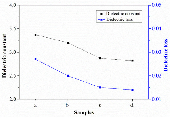 What effect does the cross-linking reaction have on the dielectric properties of the material? Figure 9 shows the dielectric properties of PEN–OH films at 1 MHz with different heat-treatment temperatures, including dielectric constant and dielectric loss. It can be seen that sample a, without heat-treatment, shows a dielectric constant of 3.37 at 1 MHz. According to previous reports [13], the dielectric constant is 3.4, 4.1, 4.2, 4.5, 4.5 at 1 MHz in the PEN(BPA), PEN(PP), PEN(HQ/RS), PEN(PP/HQ), PEN(PPL), respectively. Compared to the above conventional PEN, this PEN–OH contains trifluoromethyl and shows a lower dielectric constant. As the heat-treatment temperature increased, the dielectric constant of the films decreased gradually. When the heat-treatment temperature reached 360 °C, the dielectric constant of sample d decreased to 2.82. The dielectric loss of the samples with different heat-treatment temperatures shows the same trend as the dielectric constant. The decrease of the dielectric constant and dielectric loss is mainly due to the fact that as the heat-treatment temperature increases, the degree of cross-linking reactions among the nitrile groups increases, resulting in the decrease of the amount of nitrile groups in the samples. The reduction of nitrile groups leads to the decline of the polarity of the material, resulting in a gradual decrease in the dielectric constant and dielectric loss of the samples.
