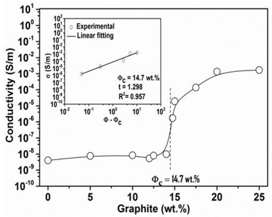 Percolation threshold () determination plot. Electrical conductivity of PET/graphite micro-composites as a function of graphite content. The inset plot is versus .