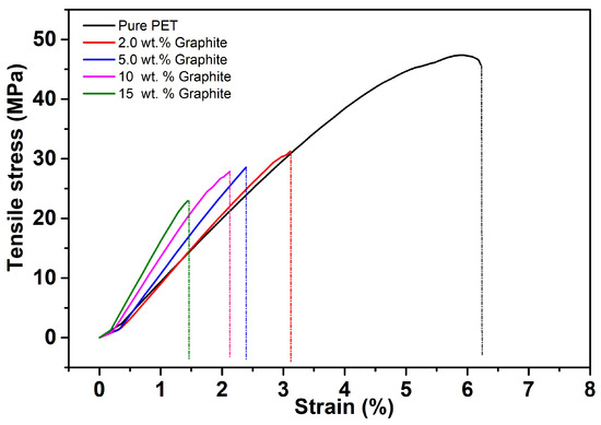 As expected, a rigid micro-filler-like graphite increases the composite stiffness, which is reflected in Figure 6 (top) by a continuous increment of the composite modulus of elasticity. In Figure 6 (bottom), a comparison is presented with some data available in the literature. Afterwards, several uniaxial-type tensile tests have been performed for various filler concentrations. The stress–strain graph presented in Figure 7 illustrates that, in addition to the stiffness enhancement by the graphite filler, it increases the embrittlement of the PET/graphite composite in contrast to a pure PET. Therefore, a PET/graphite composite with 15 wt.% filler breaks at a tensile strain of 1.5% compared to its pure counterpart that breaks at a deformation of 6.5%.