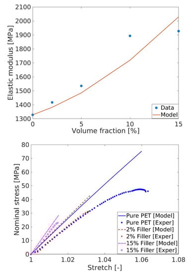 As shown in the previous section, t fillers increase the mechanical stiffness of the reinforced-PET composites, which is depicted with increments of the elastic moduli (see Figure 5). At first, the model for elastic moduli enhanced presented in Equation is fitted to the experimental data. Results are presented in Figure 8 (top) where the parameter g is identified as 2.67, which is within the range (larger than one).