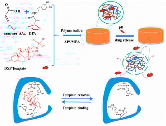 - Wei, P.J.; Song, R.M.; Chen, C. A pH-Responsive Molecularly Imprinted Hydrogel for Dexamethasone Release. J. Inorg. Organomet. Polym. Mater. 2018, 29, 659–666. [Google Scholar] [CrossRef]