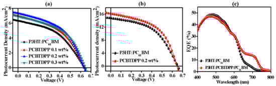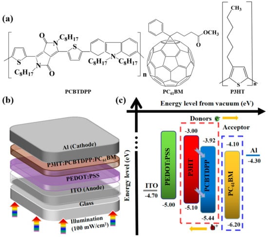 Recently, polymer solar cells (PSCs) have triggered stupendous attention owing to their cost-competitiveness, mechanical flexibility, lightweight nature, and compatibility for large area deposition [1,2,3,4,5,6,7]. One of the most widely used donor/acceptor (D/A) photoactive blend systems is poly(3-hexylthiophene):[6,6]-phenyl-C61-butyric acid methyl ester (P3HT:PC61BM) [8,9,10,11,12]. So far, the power conversion efficiency (PCE) of PSCs with the conventional P3HT:PC61BM system have achieved 3–5% [13,14,15,16]. However, further development on P3HT:PC61BM-based PSCs is highly warranted to overcome the low short-circuit current density (Jsc), which can be improved by tailoring the relatively narrow absorption range due to the wide-bandgap nature of the P3HT. To widen the light absorption capability of the P3HT:PC61BM and to further improve photovoltaic (PV) performance, numerous strategies have been widely demonstrated, such as synthesizing new low-bandgap materials, employing tandem PSCs, doping suitable D/A molecules, etc. [17,18,19,20,21]. Among them, adopting ternary-based PSCs can be considered one of the most promising strategies to manipulate/fine-tune the PV performance parameters of the PSCs [22,23]. Recently, a ternary photoactive blend system (D/D/A, D/A/A) featuring a low-bandgap material with broad absorption spectra has been realized as a potential strategy to improve optical absorption, optimize the exciton separation, and charge carrier extraction in active layer with an aim of enhancing the Jsc and other performance parameters of PSCs [24,25,26,27]. Herein, we explored a new kind of unexplored low-bandgap polymer, poly[N-9-hepta-decanyl-2,7-carbazole-alt-3,6-bis-(thiophen-5-yl)-2,5-dioctyl-2,5-dihydropyrrolo[3,4]pyrrole-1,4-dione] (PCBTDPP, Figure 1a), as an efficient donor into P3HT:PC61BM active system to construct high-efficiency ternary PV devices with the device architecture (Figure 1b): indium tin oxide (ITO) glass/poly (3,4-ethylene dioxythiophene): poly (styrene sulfonate) (PEDOT:PSS)/binary or ternary photoactive blend system/Al. Figure 1c depicts the energy level bands of components involved, and their energy levels are derived from the relevant reports [28,29,30,31].