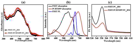 Figure 2a showed the UV-vis absorbance of as-deposited P3HT:PC61BM and P3HT:PCBTDPP(0.2 wt.%):PC61BM active layers. Figure 2b showed the UV-vis absorbance of as-casted P3HT and PCBTDPP thin films, along with their respective PL spectrum of P3HT. The P3HT:PCBTDPP(0.2 wt.%):PC61BM film exhibited significantly improved absorption potential in the broadband range with high intensity, which is attributed to the complementary absorption spectra capability of PCBTDPP film (Figure 2b) [36,37]. PCBTDPP displayed strong light-absorbing ability from 615 nm to 700 nm, and the main absorption peaks of PCBTDPP was centered at 681 nm. Especially, the broaden absorption range between 720 nm and 800 nm in P3HT:PCBTDPP(0.2 wt.%):PC61BM blend system implied that the lower energy photons could be absorbed by PCBTDPP. It is believed that good photon harvesting and efficient charge collection are the primary factors that help to enhance Jsc. Results from Figure 2b indicated that the PCBTDPP absorption range covered the PL spectrum of P3HT, and could result in Forster resonance energy transfer (FRET) between P3HT and PCBTDPP [38]. The exciton generated in P3HT or PCBTDPP can be either dissociated at the D/A interfaces or directly transferred from P3HT to PCBTDPP via FRET before dissociation [39]. The HOMO and LUMO energy levels of P3HT are −5.10 eV and −3.00 eV, while PCBTDPP shows the HOMO of −5.44 eV and LUMO of −3.92 eV. The differences between LUMO levels of P3HT/PCBTDPP and LUMO of PC61BM are 1.10 eV and 0.18 eV, respectively, which can provide improved exciton dissociation and enhanced charge transport in P3HT:PCBTDPP(0.2 wt.%):PC61BM layer. Herein, the energy level of PCBTDPP was ideally placed in conjunction with P3HT and PC61BM for a broadened absorption potential and enhanced charge carrier transport. Additionally, the PL (Figure 2c) for two active layers was acquired under 550 nm light excitation. The peak of P3HT PL intensity at ~552 nm was considerably quenched in P3HT:PCBTDPP(0.2 wt.%):PC61BM as compared to P3HT:PC61BM, suggesting an effective exciton dissociation in the fabricated ternary blend system [40].