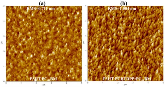 The morphological aspects of the active blend system highly influence the performance of the PV device. To probe the morphological aspects of P3HT:PC61BM and P3HT:PCBTDPP(0.2 wt.%):PC61BM, tapping mode AFM images (5 µm × 5 µm) were recorded and displayed in Figure 3a,b. Desirable nanoscale phase separation with uniform coverage and fiber-like structure (P3HT chains) with an excellent bicontinuous interpenetrating network were clearly observed for P3HT:PCBTDPP(0.2 wt.%):PC61BM film, resulting from effective exciton dissociation, improved charge transport and reduced charge recombination [41,42]. The root mean square (RMS) roughness of binary and ternary active layers are 0.711 nm and 1.004 nm, respectively. The rougher ternary active layer could provide a larger interface contact between the P3HT:PCBTDPP(0.2 wt.%):PC61BM film and Al, benefitting charge collection as well as a rapid pathway for charge transport, which leads to the quenching of PL response [43]. In addition, the rougher morphology might also induce stronger internal reflection, thus enhancing light absorbance of the active blend system. The change in RMS values indicated that the doping of PCBTDPP into P3HT:PC61BM allowed modification of the miscibility of P3HT and PC61BM [44,45].