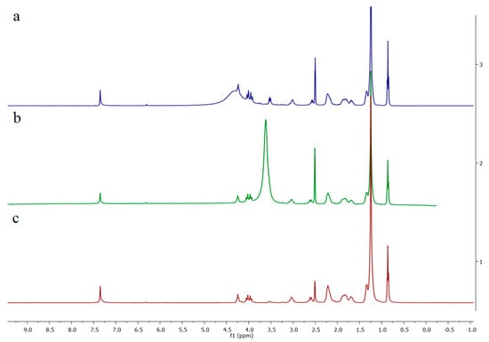 1H-NMR spectra (400 MHz, DMSO-d6, 323 K) of compound 6. (a) Conventional, (b) adding D2O, and (c) suppressing the residual signal of D2O.