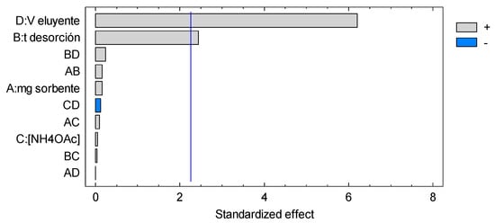 For screening, a two-level factorial design (2K) with 4 centers (K = 4) was used for a total of 20 experiments. The experimental factors were: sorbent phase mass (20 and 30 mg), desorption time (20 and 50 min), millimolar concentration of the eluent (0 and 40 mM), and volume of eluent (5 and 10 mL). The Pareto chart standardized for recovery is shown in Figure 5, where the standardized effect bars show that only the factors of eluent volume and desorption time have an effect on the response (recovery). Sorbent phase mass, concentration of the eluent and the interactions (AB, AC, AD, BC, BD, and CD) between the four variables showed no statistically significant effect.