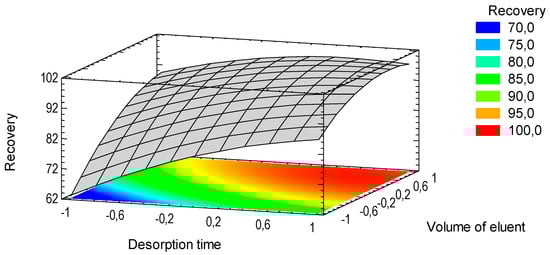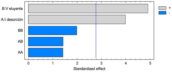 Subsequently, the factors eluent volume and desorption time were optimized, applying a central composite design (2K + 2K + C), centered on the faces and with two centers, for a total of 10 experiments [49]. The levels of each factor were volume of eluent: 5.0, 7.5 and 10 mL, and desorption time: 15, 30, and 45 min. Figure 6 shows the Pareto chart, where the standardized effect bars reveal that both the volume of eluent and the time of desorption have a marked influence on the recovery of the analyte. The factor with the greatest effect is the volume of eluent, and the interactions between the two factors have a very weak effect on the response.