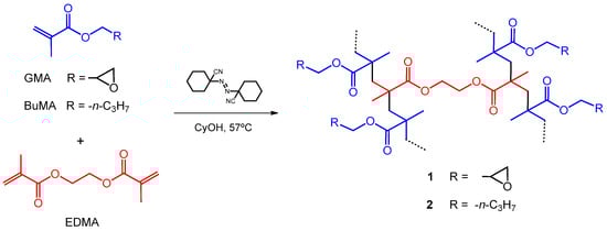 Polymers poly(GMA–co–EDMA) (1) and poly(BuMA–co–EDMA) (2) were synthesized following a procedure that was adapted from the methodology of Okanda et al. [37]. As depicted in Scheme 1, EDMA and BuMA (or GMA) were mixed in cyclohexanol:dodecanol mixture and reacted at 57 °C in presence of 1,1-azobis(cyclohexanecarbonitrile) (ABCN) to form 1 and 2, respectively. The chemical characterization was performed via FT-IR, Raman spectroscopy, and elemental analysis and the morphological characterization via TGA and SEM. The polymers had been previously synthesized by other authors [41,42], and our experimental data agreed with those reported.