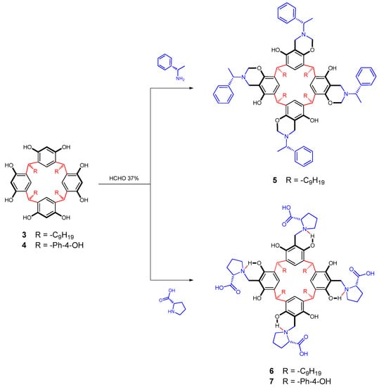 For the present study, we chose the resorcinarenes tetranonylresorcinarene (3) and tetra(4-hydroxyphenyl)resorcinarene (4) for the aminomethylation reaction with chiral aminocompounds (S)-(-)-1-phenylethylamine and l-proline. The synthesis of resorcinarenes 3 and 4 was carried out starting from resorcinol with the respective aldehyde in a mixture of ethyl alcohol and water (1:1) at reflux, in accordance with how it is described in the literature and as we have previously developed it [34,35]. Once the resorcinarene tetranonylresorcinarene (3) was obtained, the first step involved reaction with the chiral amine (S)-(-)-1-phenylethylamine in presence of formaldehyde via base-catalyzed cyclocondensation, as per the method described in the literature (Scheme 2) [43]. The product obtained in the reaction was easily purified by means of recrystallization and was characterized via spectral techniques, including FT-IR, 1H-NMR, 13C-NMR, and 2D-NMR experiments (see Supplementary Material). In this way, the aminomethylation product of 3 with (S)-(-)-1-phenylethylamine showed that FT-IR analysis was in agreement with the organic functionalities present, the hydroxyl group stretches at 3347 cm−1 (O-H) and 1468 cm−1 (C-O) being the principal features observed, whereas the C-N of the amine group can be seen at 1286 cm−1; the bands of the alkyl substituent and the aromatic ring can also be seen at 2923 and 3027 cm−1, respectively.
