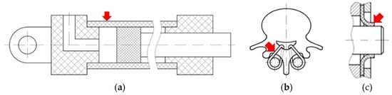 Deformed parts (indicated by red arrows) made of polymeric materials interacting frictionally: (a) hydraulic cylinder tube; (b) spine stabilising wires; and (c) shaft lip seal.