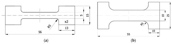 The samples for tribological tests during tensile testing had a shape similar to the outline of the so-called “paddle” presented in the EN ISO 527:2012 standard for the determination of tensile properties of plastics. As the space at the test stands was limited, the shape of the sample was reduced and slightly modified. The research was carried out during frictional interaction in the direction parallel and perpendicular to the direction of the tensile force vector. Therefore, two types of samples suitable for both situations were prepared (Figure 2). Samples were cut from 2-mm thick plates. The gripping sections of the samples placed in properly profiled callipers ensured that the samples were securely clamped. Measurements were made in the measuring section distant from the grip section to avoid analysis of the material in the notch impact area.