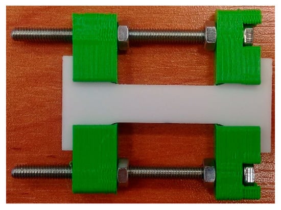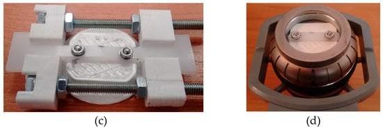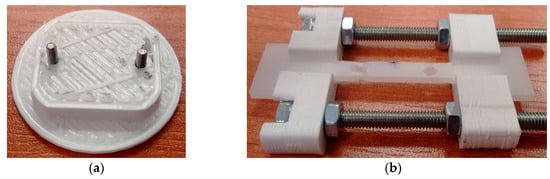 Special handles with PLA (polylactide) callipers were designed and manufactured in three-dimensional printing technology (Figure 3). The callipers had sockets to ensure that the sample is locked in place. The shape of the grip (holder) was adapted to each test stand in order to avoid collisions with the elements of the measuring instrument.