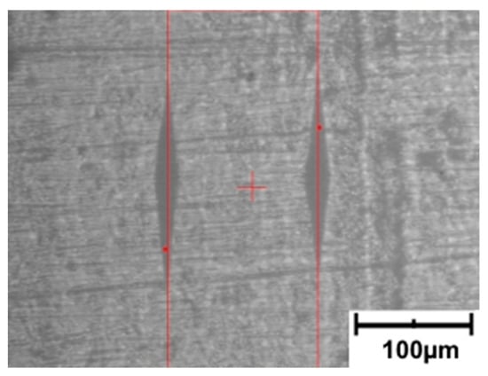 The value of deformation was determined by measuring the distance between the imprints of the indenter used to measure microhardness using the Knoop method. The imprints were oriented in a direction perpendicular to the direction of the tensile force vector. The initial distance between markers (Figure 4) was determined for an undeformed sample. Subsequently, the measurement was repeated after the sample deformation. The difference in distance between the markers allowed to determine strain ε. This way of determining the strain allowed us to obtain a precise value of the strain in the place where further measurements were made, i.e., microhardness, surface free energy, or wear.