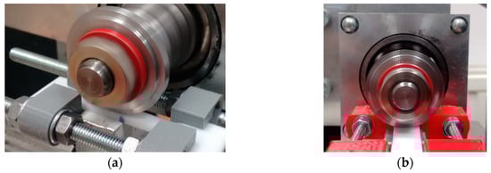 The combination of stretched polymer–steel roller when measuring wear in a direction: (a) parallel and (b) perpendicular to the direction of the tensile force vector.