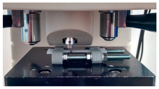 Shimadzu HMV-2 microhardness tester was used during the research. The measurements were carried out by maintaining the samples in a deformed state using a grip (Figure 7). For the Knoop microhardness measurements, the lowest load (98.07 mN) and the lowest load time (5 s) were used. The measured diagonal lengths of the indentations ranged from about 170 µm (for undeformed material) to about 220 µm (for deformed material). Using the known angle of the indenter (172°30′) and trigonometric relationships, the depth of the imprint after the removal of the indenter was calculated. It ranges from approximately 5 to 7 µm.