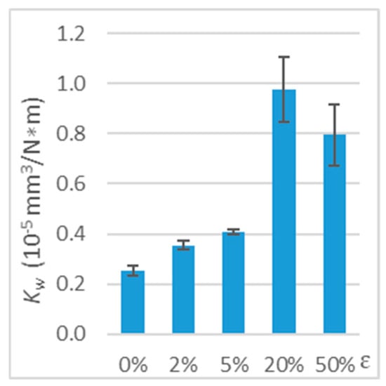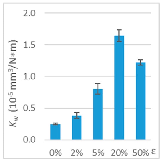 The results showed a significant effect of tensile stress on the wear of the polymer material when the direction of friction was parallel to the direction of the tensile force vector. In the terms of 20% strain, the Kw wear coefficient was 5.5 times higher than in the terms of undeformed polymer (Table 1 and Figure 9). With such deformation (ε = 20%), the wear coefficient was the highest. Further increase in deformation to 50% strain led to a reduction in the wear coefficient. In addition, a significant increase in the wear coefficient (51%) was already recorded for 2% strain.