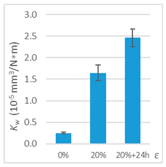 Wear coefficient (Kw) for deformed polymer (working with steel, tension, parallel direction, 24h, v = 0.33 m/s, and T0 = 23 °C).