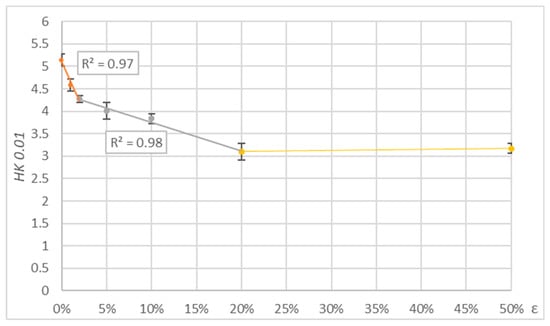 The results of measurements in the form of average values of microhardness and their percentage change for the parallel and perpendicular settings of the indenter are presented in Table 4. For measurements perpendicular and parallel to the direction of deformation, the tendency of microhardness change with deformation was similar. Microhardness decreased with the deformation. For this reason, the graphs are limited to showing the results of parallel direction measurements (Figure 12).