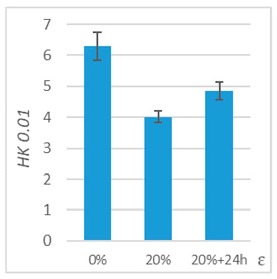 The obtained results showed a significant change in the PE-HD wear coefficient. Comparing the results (Table 3 and Figure 11) for ε = 20% deformation immediately after stretching and the results 24 h after stretching, the PE-HD wear coefficient 24 h after stretching is approximately 50% higher than for immediate deformation and 879% higher than for undeformed samples.