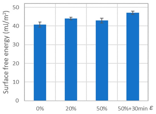 For PE-HD after tension to 20% and to 50% strain, the surface free energy increased by 8% and 6%, respectively (compared to the value obtained for the undeformed sample). Maintaining the deformation caused an increase in the value of free surface energy by about 10%, which in the end constituted about 16% more than for the undeformed sample (Figure 14).