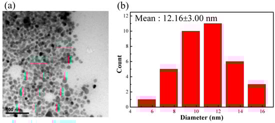 The iron oxide nanoparticle synthesized by reacting 2 mmol FeCl3·6H2O in alkaline solution with the addition of 15 mmol oleylamine surfactant is nanoscale with narrow size distribution, as shown in Figure 1. The average size measured from TEM was 12.2 ± 3.0 nm. Furthermore, the obtained nanoparticles were highly soluble in organic solvents such as tetrahydrofuran or toluene. In addition, there was no aggregation between particles observed in TEM images. Evidence from FTIR test indicated the presence of OAM surfactant on the surface of synthesized particles as shown in Figure S1. Two sharp bands at 2923 and 2852 cm−1 are attributed to the –CH asymmetric stretching vibration and symmetric stretching vibration, respectively. In addition, the band at 1590, 1629, and 3008 cm−1 are characteristic of the –NH2, –C=C, and =C–H bending vibration, respectively [29]. These results confirm that OAM already modified the surface of iron oxide particles. In addition, TGA analysis revealed that the amount of OAM coated on the surface the particle is 15 wt.%, as shown in Figure S2. These results suggested that the surface of the nanoparticles were coated with OAM surfactant. The bulky hydrophobic part of the surfactant promoted nanoparticles soluble in nonpolar solvents and also provided the steric isolation needed to prevent particles from aggregation due to van der Waals attraction and magnetic attraction among magnetic particles.