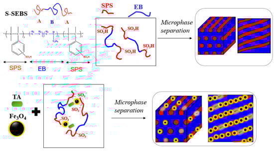 We utilized a sulfonated (styrene-b-(ethylene-ran-butylene)-b-styrene) (S-SEBS) ABA-type triblock copolymer to template TA and Fe3O4 nanoparticles within its self-assembled microstructures, as illustrated in Figure 5, to develop electroactive, magnetic composites for cancer hyperthermia therapy.