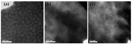 TEM image of our prepared S-SEBS polymer in Figure 6 exhibited stripe pattern, indicating formation of worm-like morphology. The darker stripes are the sulfonated styrene block (SSB) of S-SEBS block copolymers because TEM contrast originates from heavier chemical compositions, and, thus, the self-assembled SSB domain size is close to 20 nm determined from the TEM image. This atypical phase separation behavior contributes to the aggregation of the –SO3H ionic groups within the ionomeric blocks and the mixed solvents for dissolving the S-SEBS copolymer influence in the self-assembly process of the block microdomains during the casting process [39,40].
