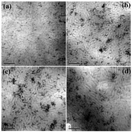 TEM image of S-SEBS polymer with various amounts of TA and Fe3O4. (a) 5 wt.% Fe3O4 and 15 wt.% TA (b) 10 wt.% Fe3O4 and 10 wt.% TA; (c) 15 wt.% Fe3O4 and 5 wt.% TA; (d) 20 wt.% Fe3O4.