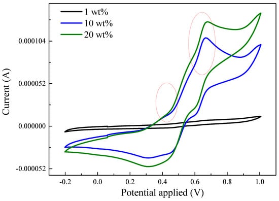 The electrochemical-responsive behavior of TA/Fe3O4 composites was investigated in HCl solution. There are no distinct redox peaks present in the cyclic voltammetry test for the composite with only 1 wt.% TA as shown in Figure 9. However, the TA composites exhibits two pairs of redox peaks as the added amount increased to 10 wt.%. The first pair of redox peaks around the 0.4 V oxidation peak was due to the transition from the leucoemeraldine state to the emeraldine state. The second pair of redox peaks with the oxidation potential around 0.65 V was attributed to the transition from the emeraldine state to the pernigraniline state. Furthermore, the redox current increased on increasing the TA added amount to 20 wt.%. These results confirm that TA could enable the composites to have electroactive properties.