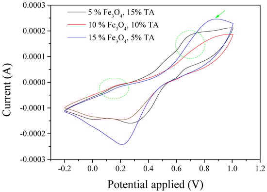 The CV test of the composite with 15 wt.% TA and 5 wt.% Fe3O4 shows that there are one weak and one strong peak around 0.2 and 0.65 V, respectively (Figure 10). This result suggests that the addition of Fe3O4 significantly influences the transition from the TA’s leucoemeraldine state to the emeraldine state compared to the transition from the emeraldine state to the pernigraniline state. The Fe3O4 began to affect TA’s transition from the emeraldine state to the pernigraniline state as its expected peak significantly diminished when the Fe3O4 increased to 10 wt.% and TA decreased to 10 wt.%. Moreover, it seems only one pair of redox peaks close to 0.8 and 0.2 V remained when the Fe3O4 amount continually increased to 15 wt.% and TA decreased to 5 wt.%. The oxidation peak and reduction peak for pure Fe3O4 are 0.8 and 0.2 V, respectively, as shown in Figure S4. Therefore, this result indicated that Fe3O4 dominated the CV results for the composite with 5 wt.% TA and 15 wt.% Fe3O4.