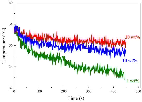 TA has shown appreciable electrical conductivity for various applications [41]. Therefore, the temperature of the TA polymer composites is expected to increase resulting from the power dissipation from eddy currents, which is proportional to the electrical conductivity of materials, when subjecting to an AC magnetic field. The polymer composites with various amounts of TA for testing were pre-heated at 37 °C and then subjected to an AC magnetic field. The temperature of the samples was recorded immediately after turning on the AC magnetic field and their time-dependent heating curves are shown in Figure 11. The temperature for all three composites (1, 10, and 20 wt.%) increased at the beginning but decreased immediately because thermal energy flows from the composites to lower-temperature surroundings. Nevertheless, the composite with 20 wt.% TA showed the lowest temperature decrease rate compared to 1 and 10 wt.% TAs. These results confirm that the TA could be utilized as a heat source to release heat to the composite so that more TA in composites exhibited a lower temperature decrease rate.
