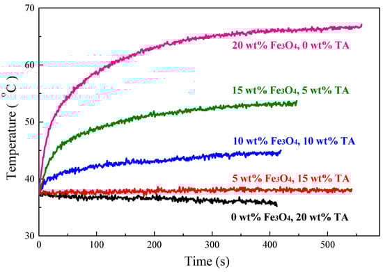 In order to obtain composites with higher value of SAR, magnetic Fe3O4 nanoparticles combined with TA were introduced into S-SEBS polymer. TA could release heat due to eddy current loss when exposed to an alternating magnetic field (AMF). In contrast, the synthesized superparamagnetic Fe3O4 nanoparticles generate heat resulting from the Neel relaxation loss due to the rotation of the magnetic moment of the particles [4]. Figure 12 shows that adding Fe3O4 nanoparticles improved the heating performance of the composites. The temperature of the composite with 15 wt.% TA and 5 wt.% Fe3O4 particles increased, compared to the continuous temperature decrease of the composite only with 20 wt.% TA, and its temperature maintained at 38 °C, meaning that the heat generated by the composite is equal to the heat escaped to the surroundings. Furthermore, the heating temperature increased with increasing time and, then, reached equilibrium temperature at 44, 53, and 66 °C, respectively, when the Fe3O4 amount was increased to 10, 15, and 20 wt.%, while maintaining the combined TA and Fe3O4 added amount at 20 wt.%. The heating performance represented as specific absorption rate (SAR) for the TA/Fe3O4/polymer composites increased on increasing the added Fe3O4 amount as summarized in Table 1. These results suggest that the Neel relaxation loss from Fe3O4 nanoparticles outweighs the eddy current loss from TA and thus dominates the heating performance of TA/Fe3O4/polymer composites.