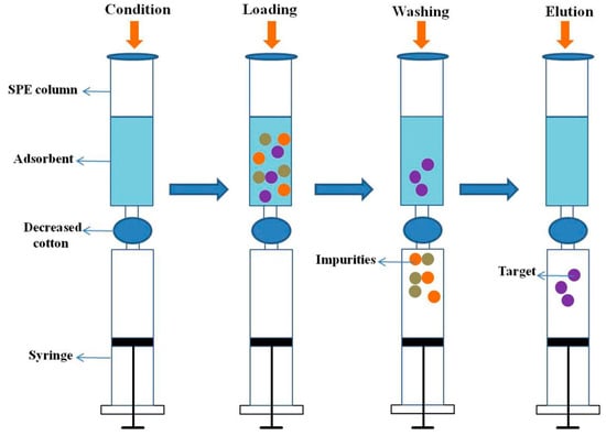 Red ginseng tea was cleaned, dried in an oven at 60 °C, and ground to a powder. A 10 g sample dried powder was ultrasonicated in 200 mL MeOH/water (80:20, v/v) at room temperature for 6 h. The suspension was then filtered as the extraction samples. The miniature SPME procedure was performed using SPE unit. A 20.0 mg sample of the obtained adsorbents was packed into SPE cartridges and connected to a conventional syringe to ensure a suitable and constant flow rate, and capped with decreased cotton in the middle of the SPE cartridges and the syringe. Figure 2 presents a schematic diagram of the miniature SPME procedure.