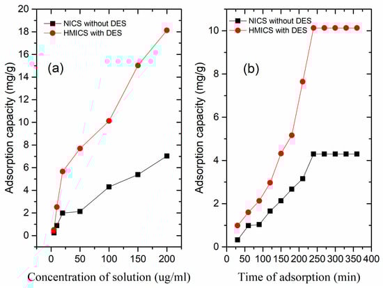 The adsorption kinetics of GA onto HMICS and NICS was investigated by varying the adsorption time from 30 to 360 min (Figure 3b). The adsorption capacity increased rapidly in the first 0–100 min, and then the increment from 125–225 min until the process approximately reached equilibrium after 225 min. At the beginning of the adsorption process, the GA could enter many empty specific binding sites easily and rapidly and mass-transfer resistance was significantly small. With time prolonging, it became difficult to find an imprinted site for target. Therefore, the adsorption rate decelerated up to reaching equilibrium. A sharp increase in the adsorption amounts towards GA by HMICS and NICS occurred within 240 min. The adsorption capacity of GA on HMICS with DES was 10.13 mg·g−1, which is approximately 2.36 times as high as that (4.30 mg·g−1) of NICS without DES. The fast and greater dynamics of HMICS adsorption were attributable to the imprinted sites.