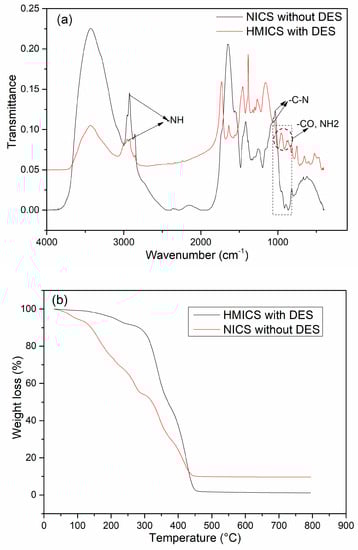 FT-IR spectra (a) and thermogravimetric analysis (b) of HMICS with DES, and NICS without DES.
